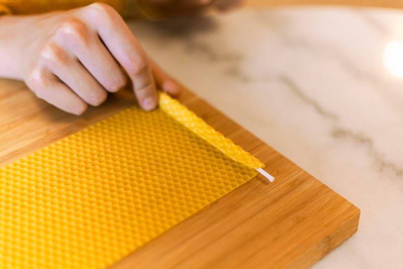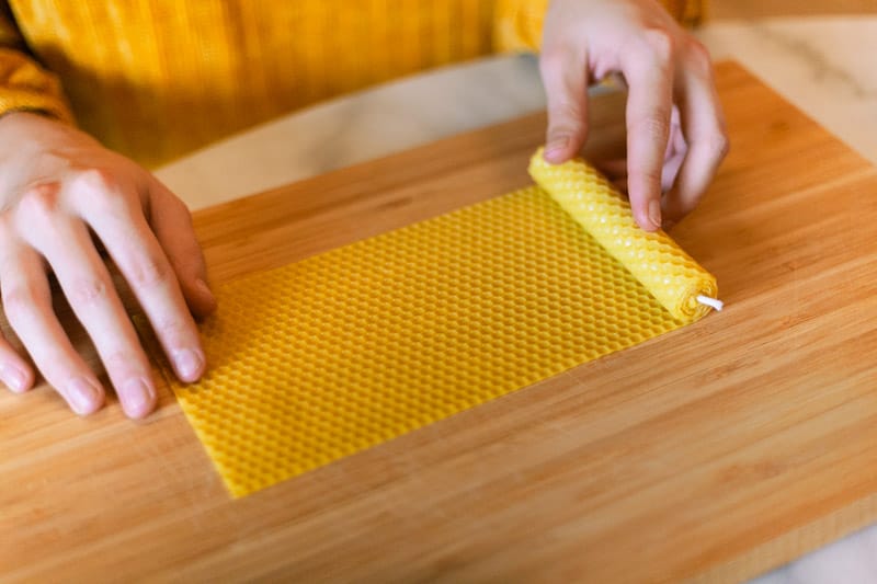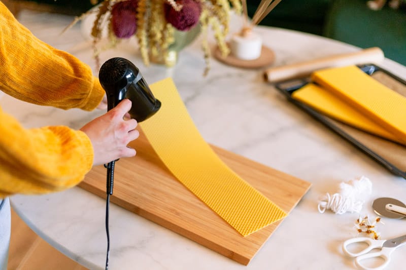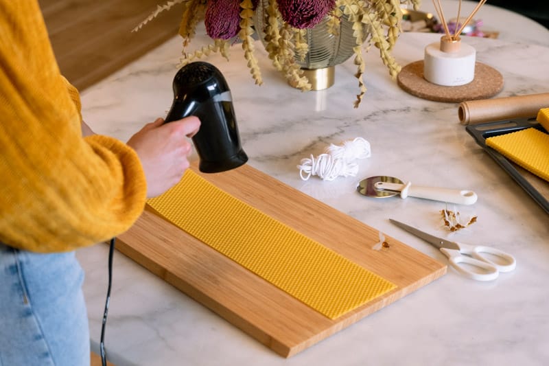 A teraz tá najzábavnejšia časť – rolovanie! Položte knôt na okraj medzistienky a začnite jemne a opatrne rolovať vosk okolo knôtu. Rolujte pomaly a rovnomerne, aby sviečka mala pekný tvar a pevne držala. Ak vám vosk počas rolovania chladne a začína byť krehký, jednoducho ho znovu jemne zohrejte fénom.